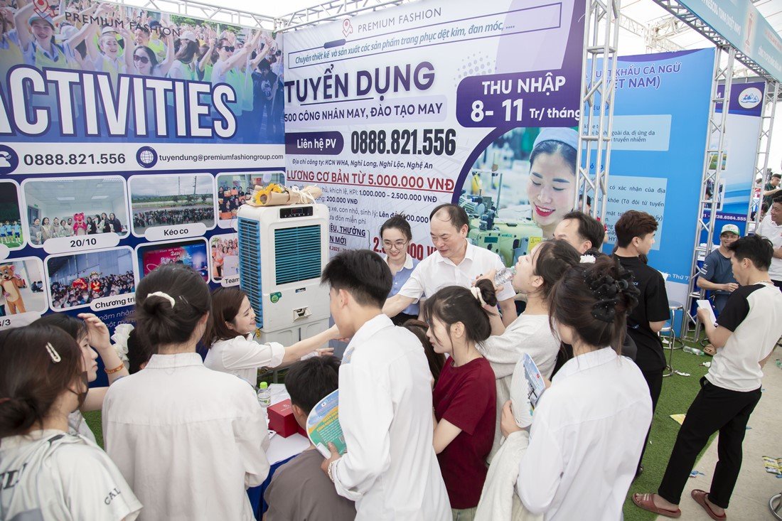 The morning session welcomed approximately 1,200 job seekers from Nghi Loc and surrounding districts engaging directly with recruiters. In the afternoon, 846 students from leading universities, colleges, and vocational schools, including Vinh University, Nghe An University, Viet-Duc College, and Korea-Vietnam College of Technology, joined the fair, demonstrating strong coordination between educational institutions and organizers.