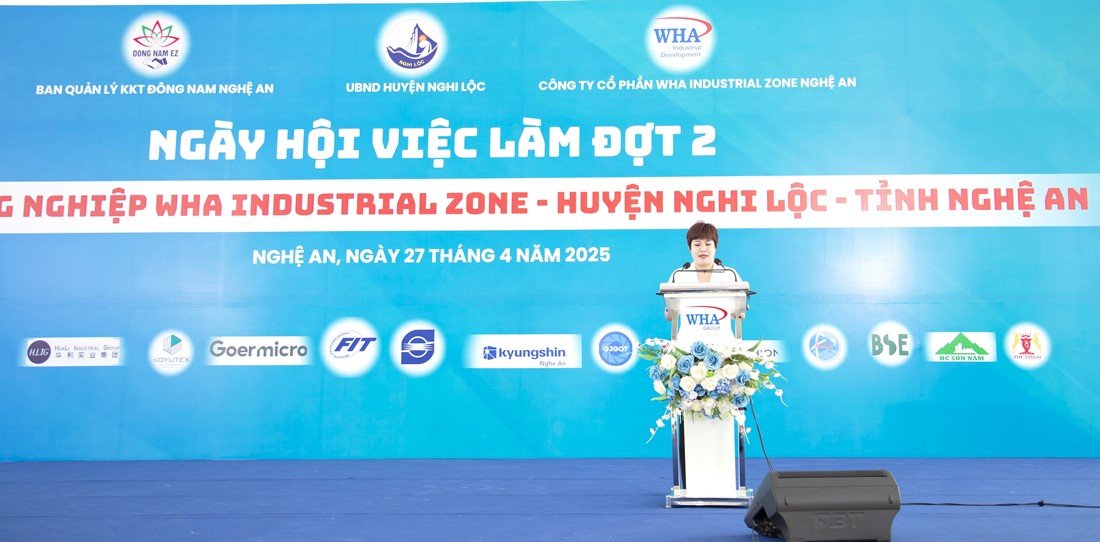 Ms. Nguyen Thi Bich Lien, General Director of WHA Industrial Zone Nghe An JSC, highlighted the zone's ongoing expansion and its increasing demand for skilled labor, emphasizing WHA's commitment to contributing to Nghe An's socio-economic development by fostering high-quality employment opportunities. She also outlined the current operational status of WHA Industrial Zone 1 - Nghe An, with Phase 1 nearly fully occupied and Phase 2 attracting increasing investment. Ms. Lien noted the presence of over 30 FDI and DDI enterprises in the zone, employing approximately 8,000 workers, and the expected creation of over 12,000 new job opportunities in the coming year.