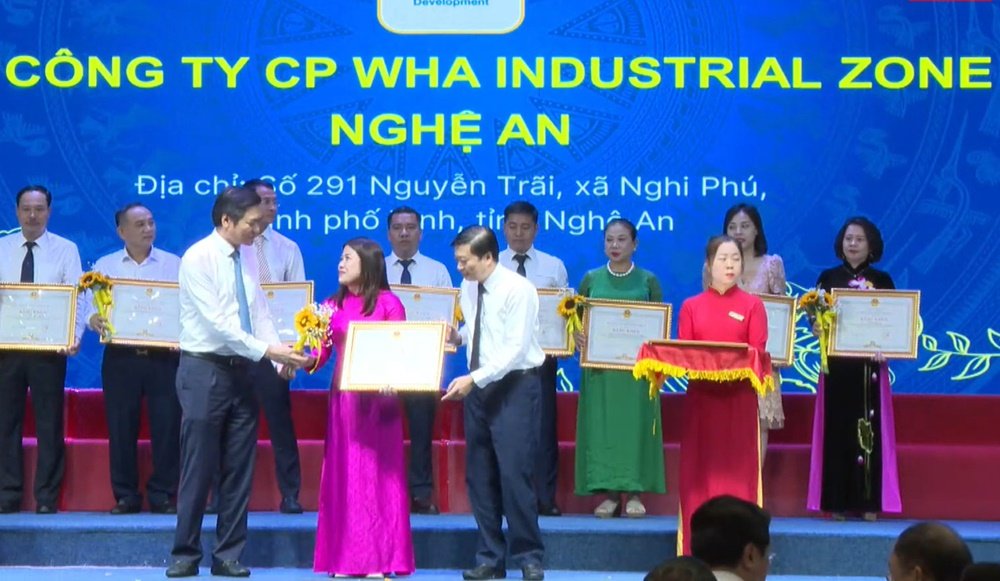 On behalf of WHA Industrial Zone Joint Stock Company, Ms. Nguyen Thi Bich Lien, general director of the company, received a certificate of merit and flowers from leaders of Nghe An province.