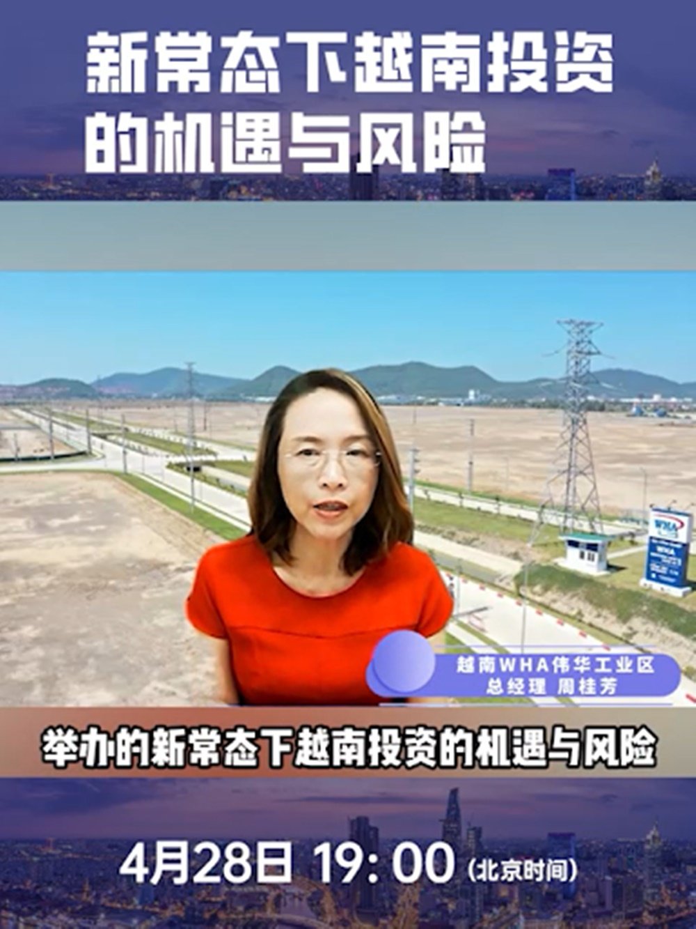 To help Chinese-funded enterprises venturing abroad deal with risks and challenges given the new situation, innovate overseas business models, and improve investment risk prevention capabilities, WHA Industrial Development PLC., represented by Ms. Anchalee Prasertchand – Director, International Department, invited potential investors to join a live forum on "Vietnam Investment Practices" and "Opportunities and Risks of Investment in Vietnam under the New Normal"