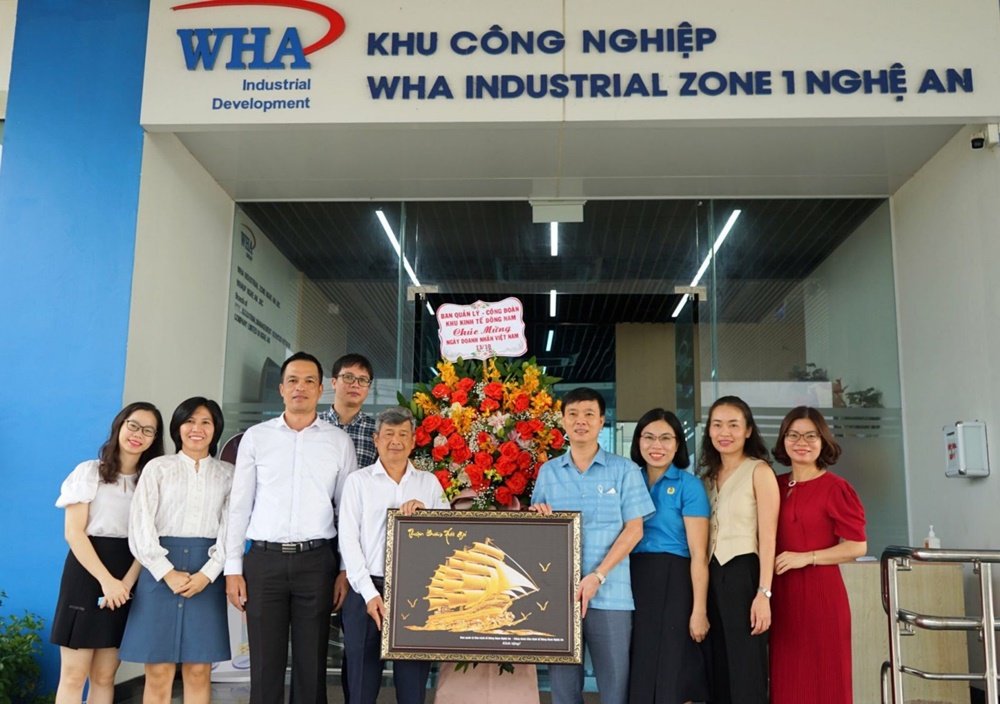 On Vietnamese Entrepreneurs' Day (October 13), Mr. Nguyen Van Hai - Deputy Head, and representatives of the Dong Nam Nghe An Economic Zone Management Board, presented flowers and congratulatory gifts to the management committee of WHA Industrial Zone Nghe An JSC.