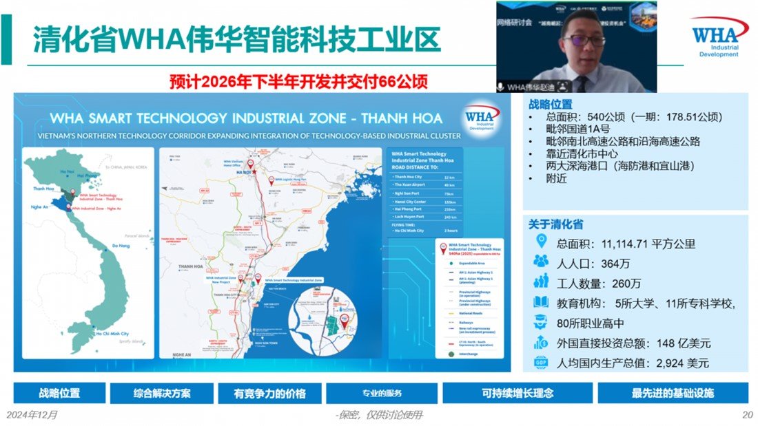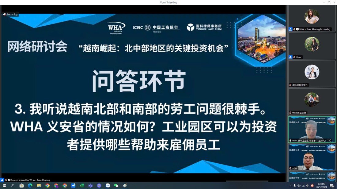 On December 6, 2024, WHA Group, in collaboration with ICBC Bank and Yingke Law Firm, hosted an exclusive webinar titled "Vietnam on the Rise: Key Investment Opportunities in the North Central Region." Held via Tencent (VOOV) Meeting, the session attracted Chinese investors eager to explore Vietnam’s thriving business environment, with a special focus on Nghe An Province—an emerging powerhouse for industrial growth.