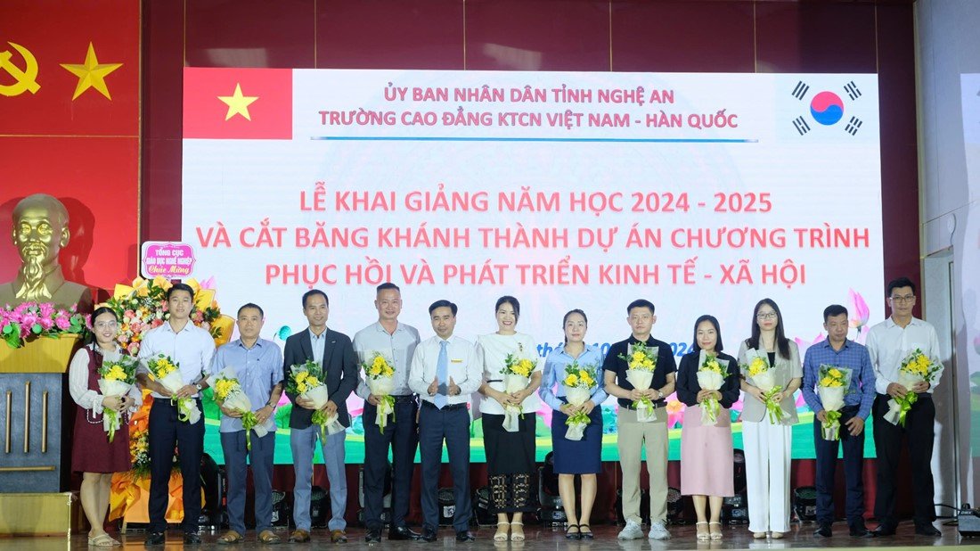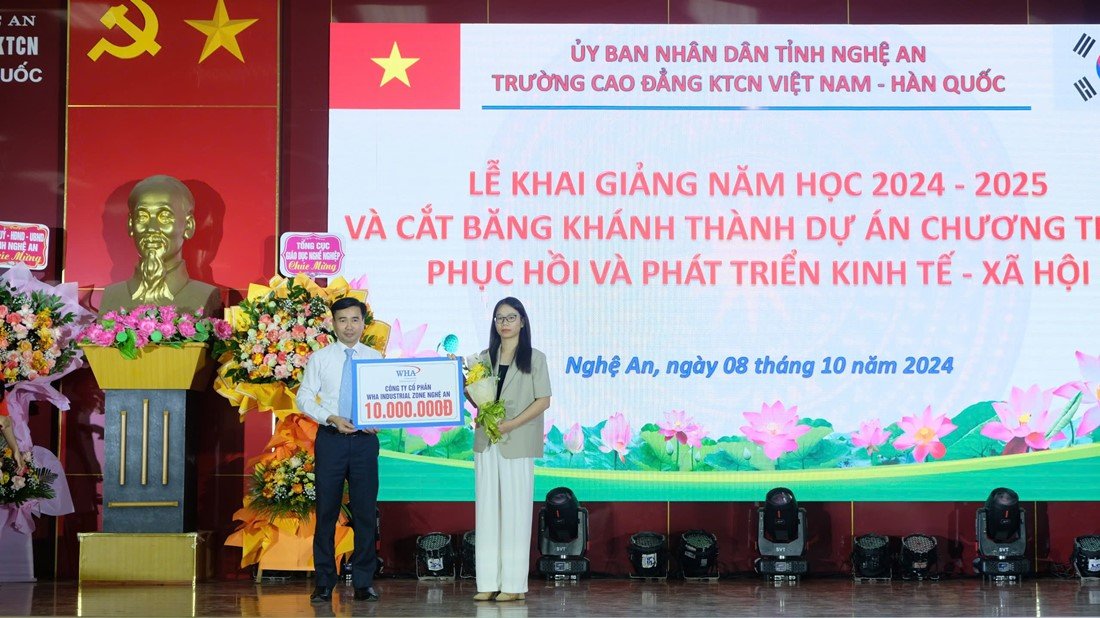 Nghe An, 8 October 2024 – WHA Industrial Zone 1 - Nghe An continues its commitment to community development and educational support by awarding scholarships to 20 outstanding students at the Vietnam-Korea College of Technology (VKCT) valued at VND 10 million, were presented during the school's 2024-2025 academic year opening ceremony and the inauguration of the Economic Recovery Program Project.
