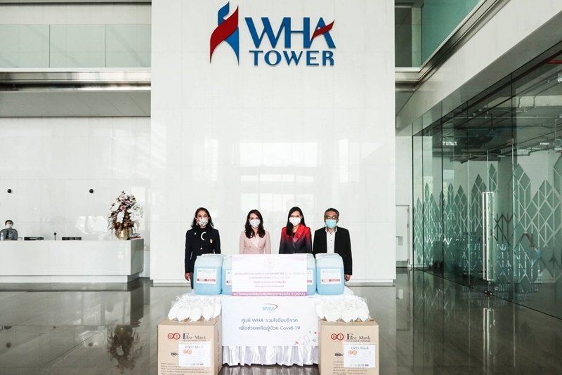 Ms. Jareeporn Jarukornsakul (2nd left), Chairman and Group CEO of WHA Corporation PCL, recently received a donation from the Ministry of Industry, delivered personally by Deputy Permanent Secretaries Mrs.Worawan Chitaroon (2nd right) and Mr Panuwat Triyangkulsri (right). A total of 20 gallons of disinfectant and 10,000 N95 masks were donated for the medical personnel at the Samut Prakan Ruamjai 5 (WHA) Field Hospital.