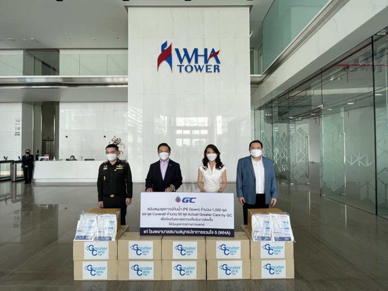 Dr. Kongkrapan Intarajang (2nd left), Director and CEO of PTT Global Chemical Public Company Limited presented a donation of 1,000 “Greater Care by GC’ PE gowns and 50 coveralls to Ms. Jareeporn Jarukornsakul (2nd right), Chairman and Group CEO of WHA Corporation PCL. This personal protective equipment will be used by the medical personnel at the Samut Prakan Ruamjai 5 (WHA) field hospital.