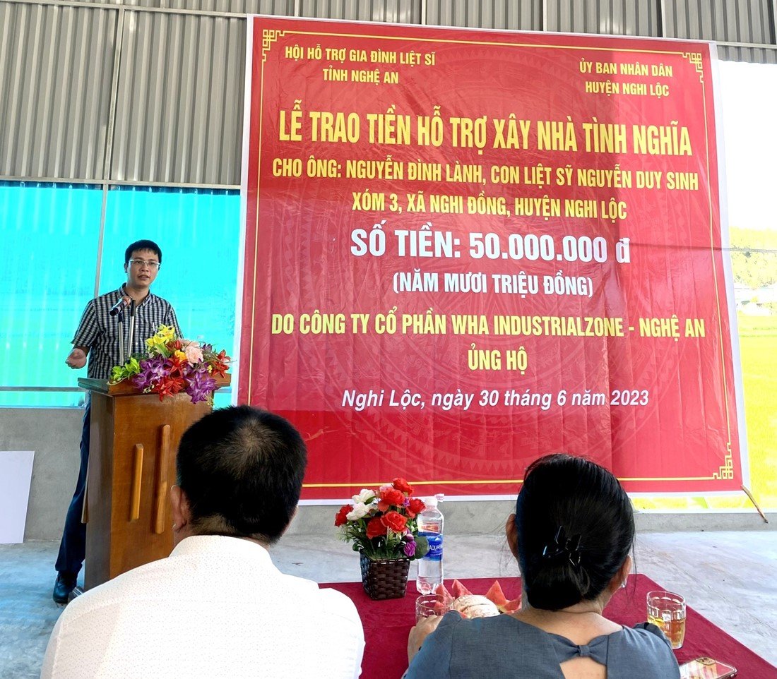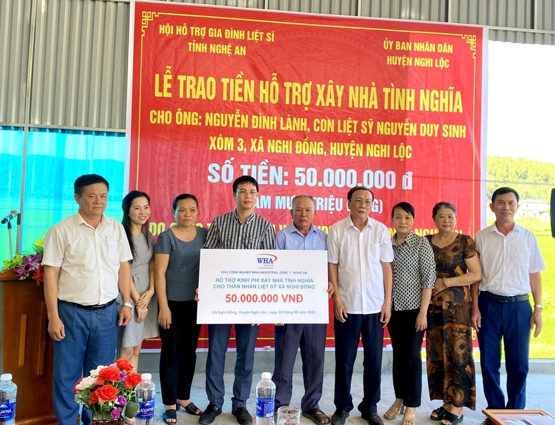 In Nghi Dong commune, WHA Industrial Zone Nghe An JSC. donated VND 50 million to support the construction of a gratitude house for Mr. Nguyen Dinh Lanh, son of martyr Nguyen Duy Sinh, in hamlet 3, Nghi Dong commune, Nghi Loc district.