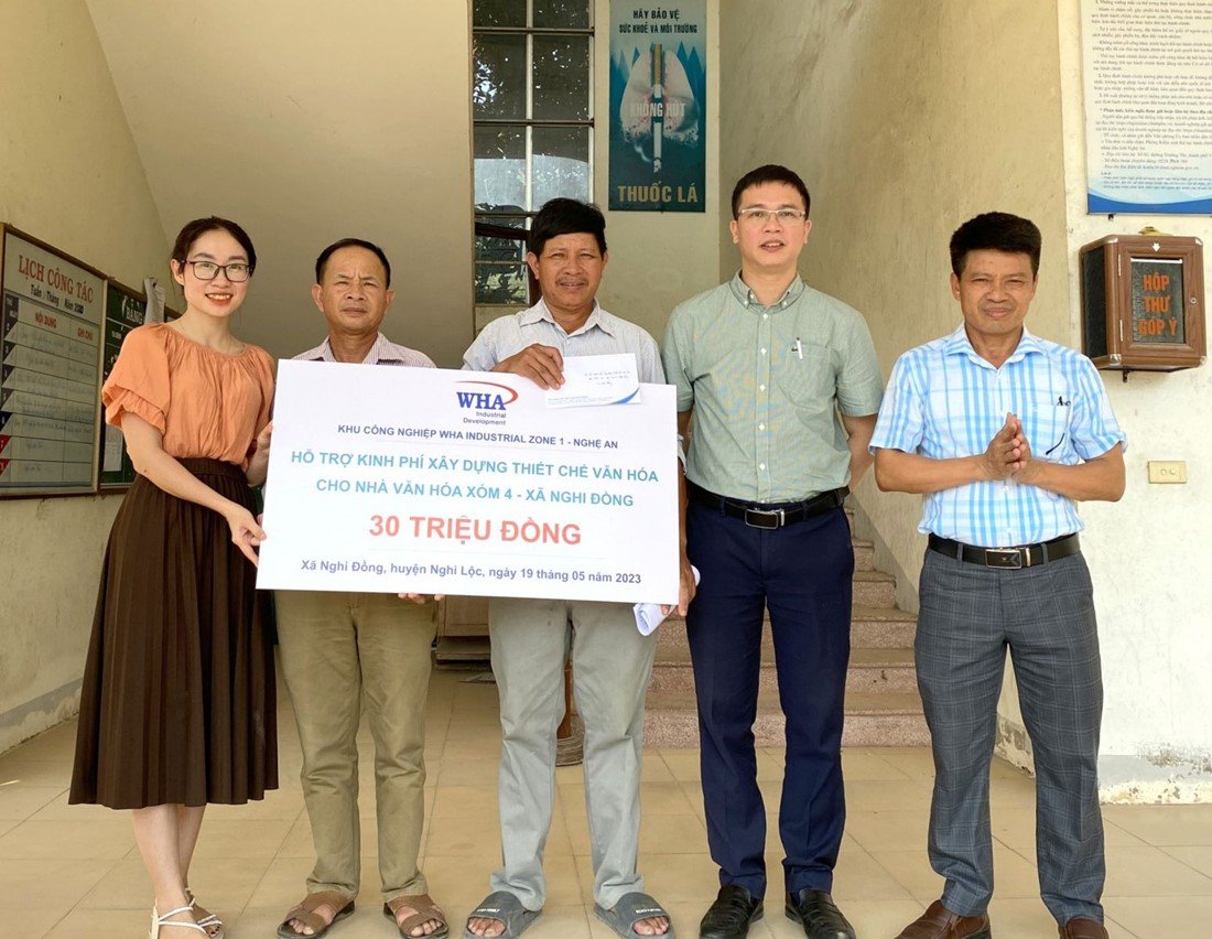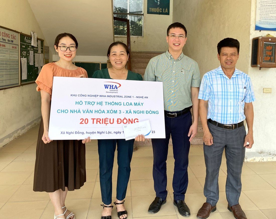 On behalf of WHA Industrial Zone Nghe An JSC , Mr. Ngo Khac Toan, Senior Manager, donated funds to the People's Committee of Nghi Dong commune to build a cultural institution for the Cultural House of Hamlet 4, and to purchase a new speaker system for the Cultural House of Hamlet 3.