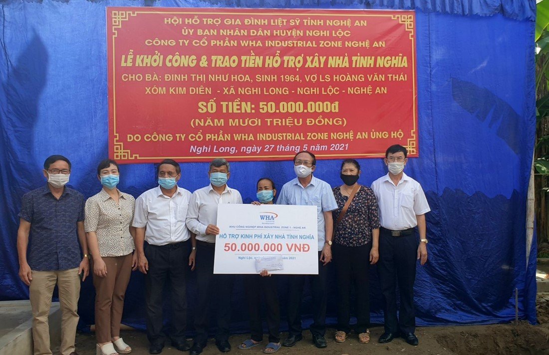 Mr. Pratuang Glaiglangdon – Senior Manager, Community Relations - WHA Industrial Zone Nghe An JSC, together with representatives of the Martyr Families Support Association – Nghe An, Nghi Loc district leaders and the Chairman of Nghi Hung commune, handed over VND 50 million to help build a house for Mrs. Nguyen Thi Tinh, as an expression of gratitude.
