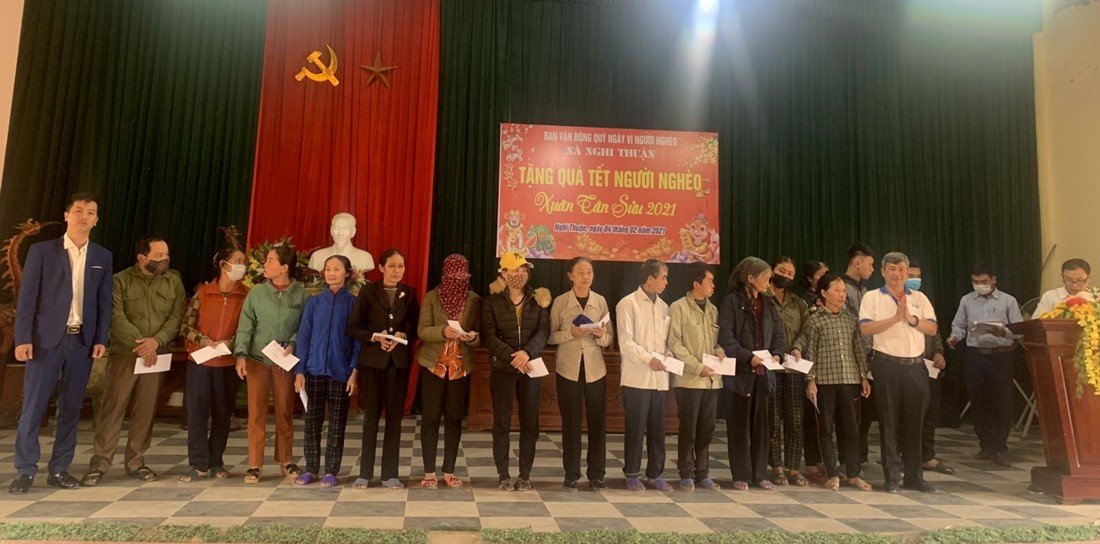 Shown in the photo, representative from Goertek Vina Precision Industry Co., Ltd distributed 172 Tet gift sets and other donations to households in Nghi Long and Nghi Thuan communes, Nghi Loc district.