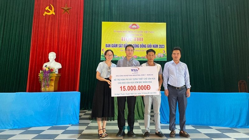 Mr. Ngo Khac Toan, Senior Manager of WHA Nghe An, presented financial support VND 40 million for renovating the concrete road at Long Thuan cemetery in Khanh Thien hamlet. Additionally, the grant contributed VND 30 million to the construction of a cultural facility for the Cultural House of Nam Nhan Hoa hamlet and Bac Nha Hao hamlets.
