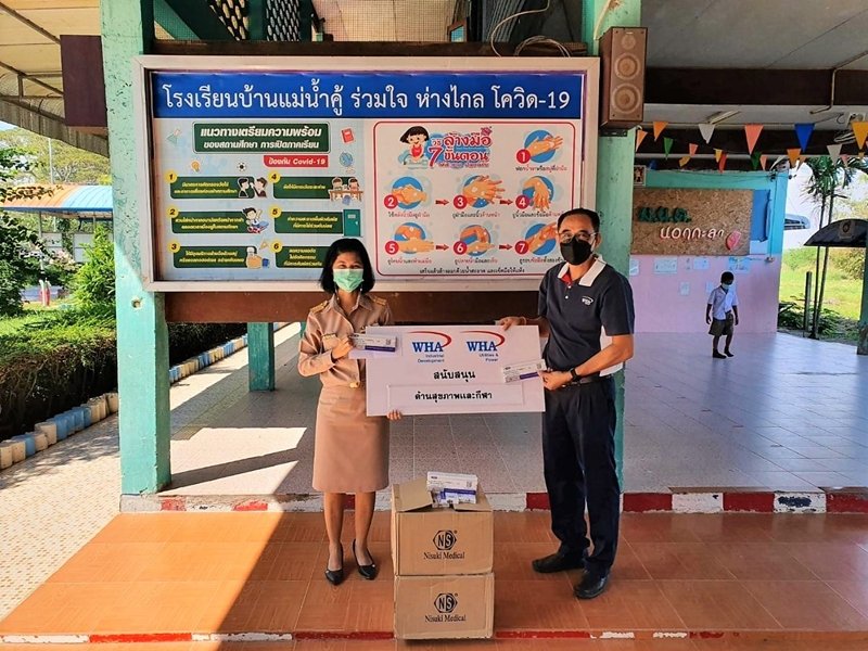 With the growing number of COVID-19 cases in the country, Antigen Test Kits were distributed by WHA Industrial Development Plc. (WHAID) and WHA Utilities and Power Plc. (WHAUP) to help reduce the spread of the virus among community members, especially among teachers and students. WHA teams went to Si Racha in Chonburi to deliver the ATKs to Ban Raweng School, Ban Surasak School and Ban Khao Khan Song School. Meanwhile, in Rayong, the kits were distributed to Ban Khlong Khanun School, Ban Khai; Mae Nam Khu School, Pluak Daeng; and the Nong Lalok Subdistrict office.
