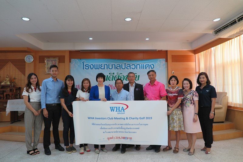 WHA Group, represented by Ms. Siyaphas Chantachairoj (5th left), Director – Corporate Marketing, WHA Corporation PCL, recently handed over a donation of 210,380 Baht to Pluakdaeng Hospital during the “Spirit of Pluakdaeng Half-Marathon” charity event. The generous donation, raised at the recent WHA Investors Club Meeting and Charity Golf 2019 and matched by WHA Group, will be used to purchase medical equipment and supplies needed to improve healthcare and treatment for people in the community.