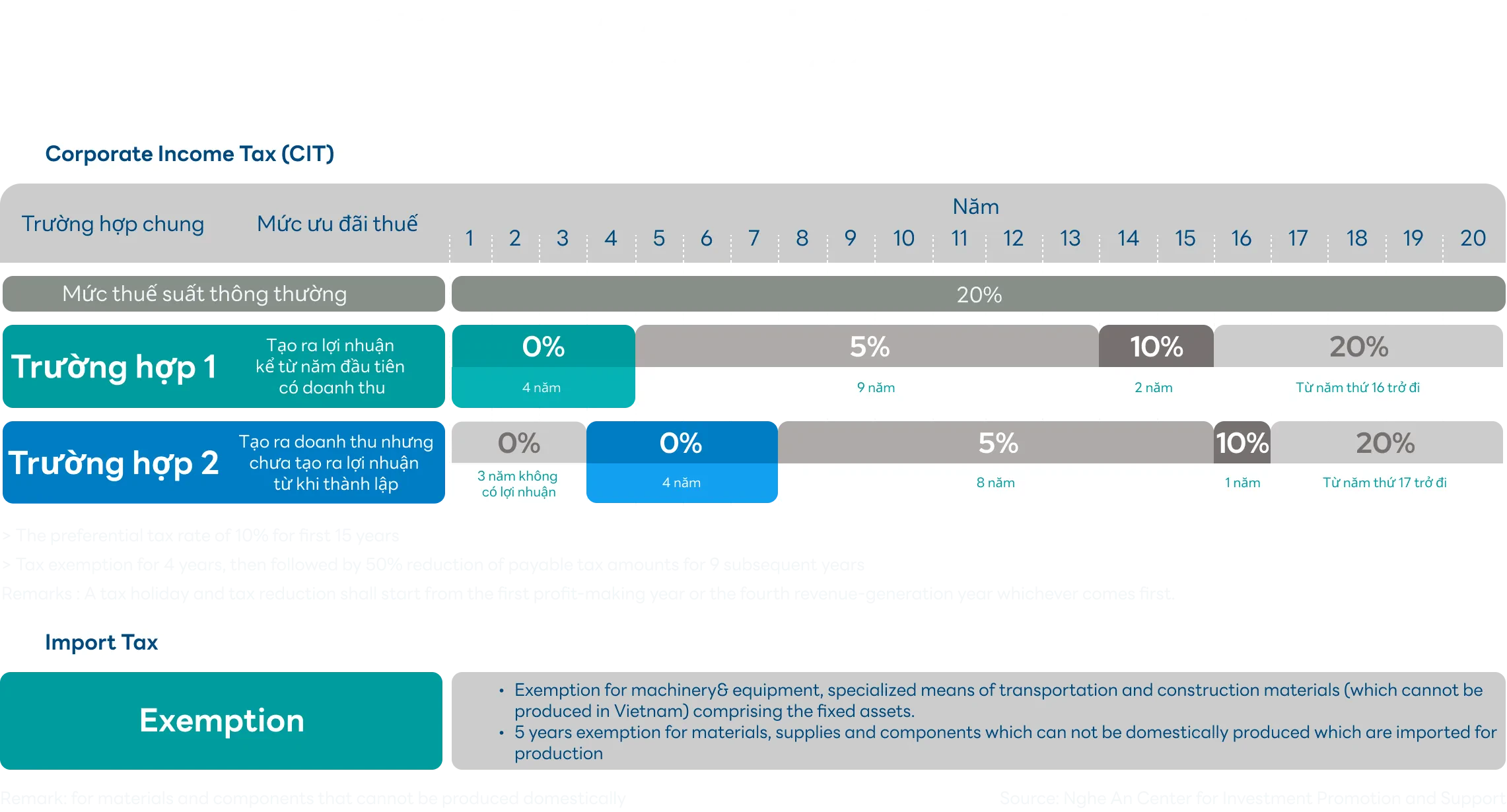 - Ghi chú: Thời gian miễn, giảm thuế được tính từ năm đầu tiên có lãi hoặc năm thứ 4 có doanh thu, tùy điều kiện nào đến trước.