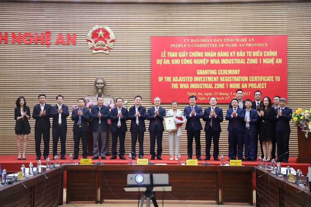 WHA Industrial Zone 1 - Nghe An, in Vietnam was granted the Revised Investment Registration Certificate for Phase 1 covering 498 hectares by the Nghe An Provincial People’s Committee during an official ceremony held recently in the presence of Nghe An and company officials. Accepting the certificate from Mr Nguyen Duc Trung, (10th left), Chairman of Nghe An PPC and Mr. Le Ngoc Hoa (8th left), Vice Chairman of Nghe An PPC, on behalf of WHA Group was Ms. Nguyen Thi Bich Lien (center), General Director, WHA Industrial Zone Nghe An JSC. With a planned Phase 1 area of 498 hectares, WHA Industrial Zone 1- Nghe An is one of the key projects of the province, representing a total investment of almost USD 100 million.