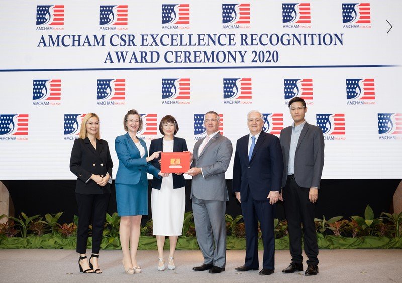 Mr. David Nardone (2nd right), Group Executive Industrial and International, WHA Industrial Development PLC, and Ms. Siyaphas Chantachairoj (3rd left), Director – Corporate Marketing, WHA Corporation PCL, recently accepted the AMCHAM CSR Excellence Recognition Award 2020 from H.E. Michael George DeSombre (3rd right), US Ambassador, on behalf of the WHA Group. This is the 11th consecutive year for WHA to receive this distinction, and its 2nd at the platinum level, for its social responsibility initiatives and sustainable programs to help uplift communities around its industrial estates.